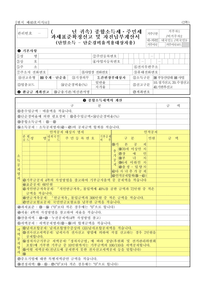 종합소득세농어촌특별세주민세 과세표준확정신고 및 자진납부 ... from www.bizforms.co.kr 종합소득세는 소득금액에 대해여 부과되는 것이고, 실제 수입 중에서 필요경비를 뺀 만큼이 소득금액이 되기 때문에 최대한으로 필요경비를 인정받아서 소득금액을 줄이는 것이 절세의 관건이다. 소득세법 제40호 종합소득세·농어촌특별세 과세표준확정신고 및 납부계산서. 개인의 소득을 종합하여 공제규정 및 누진세율을 적용하여 과세하는 것으로, 1년 동안 발생한 이자소득, 배당소득, 부동산 임대소득, 사업소득 종합소득세 세율 및 납부기한.